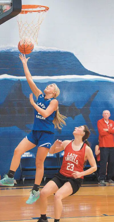 Eva Baker drives the lane and scores a bucket against Incarnate Word Academy during a three-team scrimmage in Port Aransas...