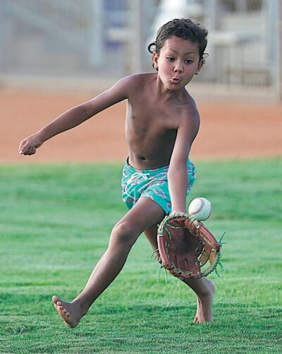 Vacationer Kash Jowers, 7, fields a ball thrown by his father, Dusty Jowers, at Jerry McDonald Field in Port Aransas...
