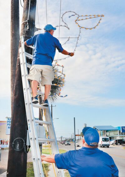 Brian Dover of the Port Aransas Parks and Recreation Department replaces light bulbs on a holiday decoration on Alister Street on Tuesday, Nov. 25. There are 49 holiday lights around Port A. Ben Johnson of parks and rec is shown holding the ladder for Dover.