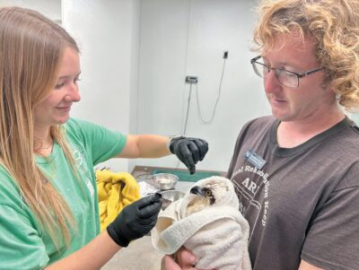 Kylan Petty, a rehabilitation specialist, feeds fish on a recent day to an osprey being held by Andrew Orgill, staff supervisor at the Amos Rehabilitation Keep (ARK) at the University of Texas Marine Science Institute in Port Aransas. Found injured in a Flour Bluff yard on Oct. 24, the bird is being treated at the ARK for a fractured wing.