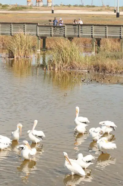 Birders watched and photographed American white Pelicans on Wednesday, Nov. 12, that have arrived at the Leonabelle Turnbull Birding Center. White pelicans migrate from the north to spend the winters here. Whooping cranes also have arrived in Port Aransas from their Canadian summer breeding grounds. Most of the flock winters at the Aransas National Wildlife Reserve near Austwell.