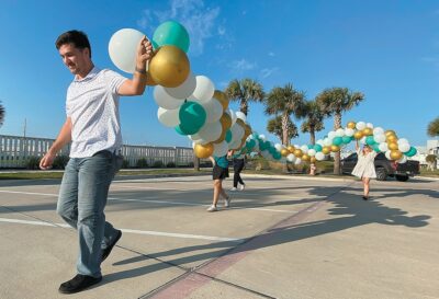 Folks including Kaleb Shafer, in front, carry a long string of balloons to the Oasis pool at Palmilla Beach Resort and Golf Community on Thursday, Nov. 20. The balloons were going to be used to decorate the grounds for a ribbon-cutting ceremony to celebrate the recent completion of a project that added amenities to the pool area.