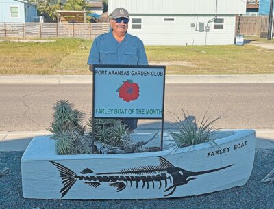 The Farley Boat Planter at the home of Heidi and Buddy Mills, 210 Ave. J, was named the November Residential Planter of the Month by the Port Aransas Garden Club. Buddy is standing behind his planter, which contains red yucca and aloe yucca.