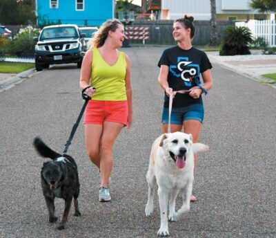 Kristi Murphy, left, of Canyon Lake and Maura Doebbler of Port Aransas go for a walk on Sorrento Avenue on a recent day with their dogs, Sid, left, a 6-year-old Ausahoula, and Holiday, an 11-year-old yellow Labrador retriever.