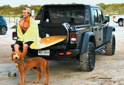 Ian Appling of Corpus Christi rests on the tailgate of his truck after surfing on a recent day. His almost-one-year-old labradoodle Rooster looks like he had a swim in the surf, too.