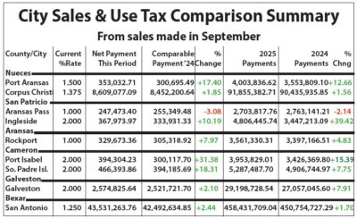 The sales tax allocation to Port Aransas for sales made in September was 17.4 percent higher than the same period in 2024, according to the latest information released by the Texas Comptroller of Public Accounts. The payment for that reporting period this year was $353,032.71. The payment from the same period last year was $300,695.49. For the year to date, […]