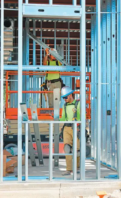 Saul Garza, foreground, and Luis Barajas install steel framing on Thursday, Nov. 6, as an expansion project continues at Port Aransas City Hall. The two work for Kelly Painting and Drywall of Victoria.