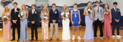 Port Aransas High School students line up in Doyle Marek Gym as the school’s homecoming court is presented on Friday, Nov. 21. From left are Eva Baker, Tyler Hofhiens, Kaise Burrill, Caden Meyer, Gavin Colglazier, Bostyn Wagner, Delilah Collings, Shane Stawar, McKennah Bacon, Reede Burrill, Autumn Lafayette and Dylan Scaff. More, including a photo of the homecoming king and queen,...