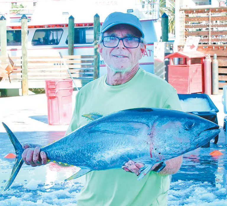 Fred Mallett of Laguna Vista shows the yellowfin tuna he caught while on a 60-hour offshore trip aboard the Scat...