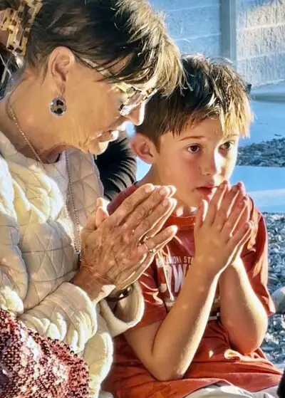 Outside St. Joseph Catholic Church, Addie Stewart, left, of Georgetown, prays with her grandson, Port Aransas resident Cooper Sheffield, 7, during the Feast of Our Lady of Guadalupe on Thursday, Dec. 11. (The spots of light on their hands are reflections from a sequined sweater.)