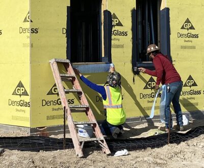 Working on the Port Aransas City Hall expansion project on recent day are, from left, brothers Johnathan and Jesus Cardenas, employees of Texas Lath of San Antonio.