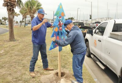 Port Aransas Parks and Recreation employee Bailey Martin, left and David Lown, grounds supervisor, install a decorated tree cutout along the loop at Roberts Point Park on Wednesday, Dec. 3. The cutout was painted by the Community pool staff. Wooden decorations are part of the nightly Holiday Lights Drive-Thru hosted by parks and rec.
